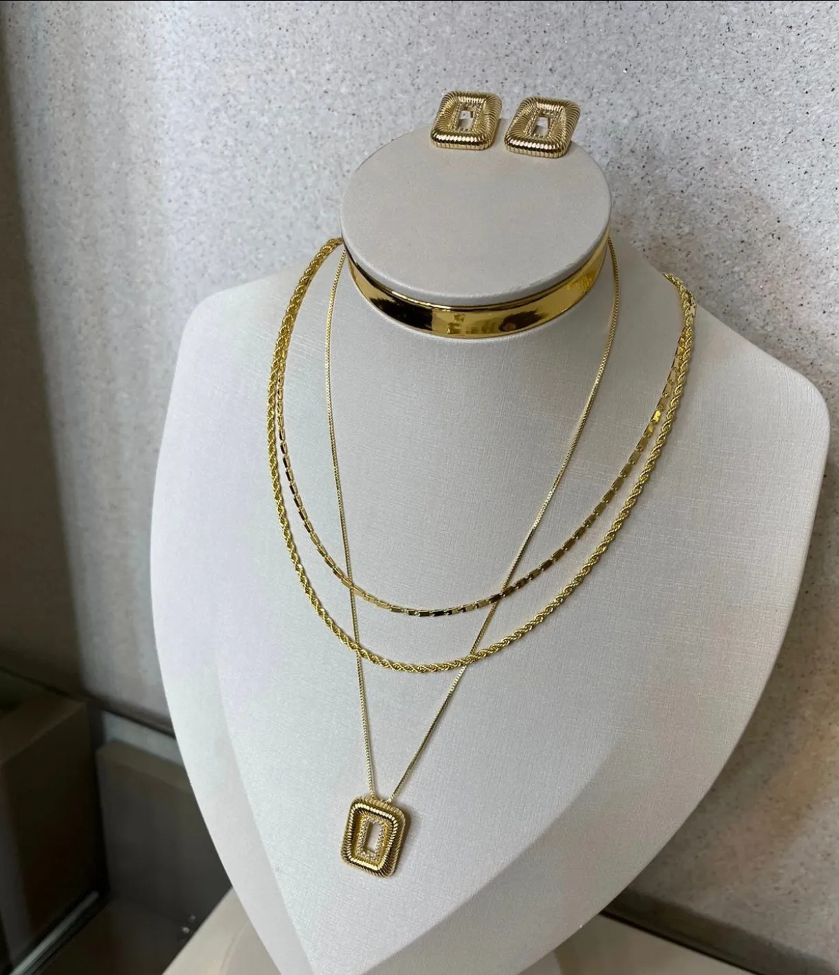 Conjunto Colar e Brinco Retangular Cravejado