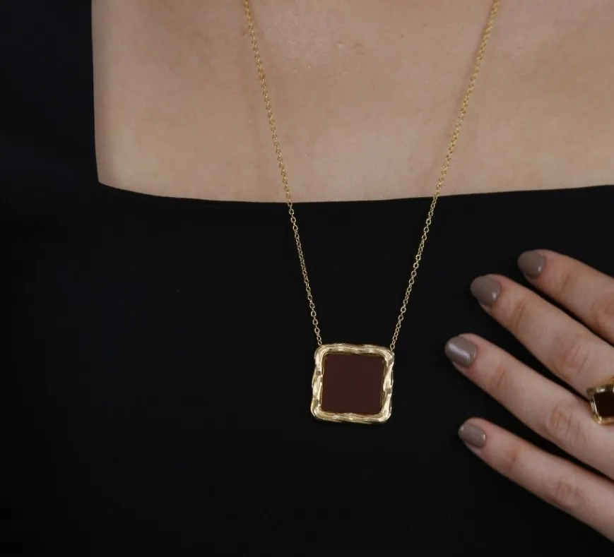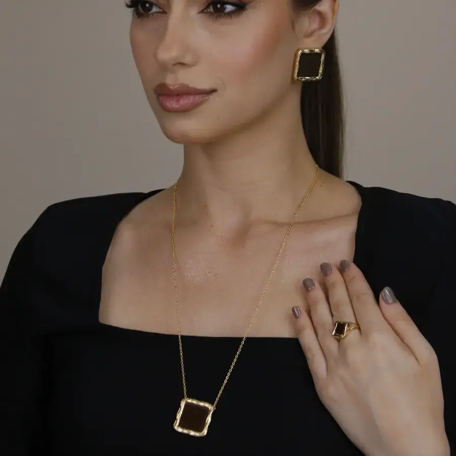 Conjunto Colar e Brinco Quadrado trabalhado em pedra acrílica