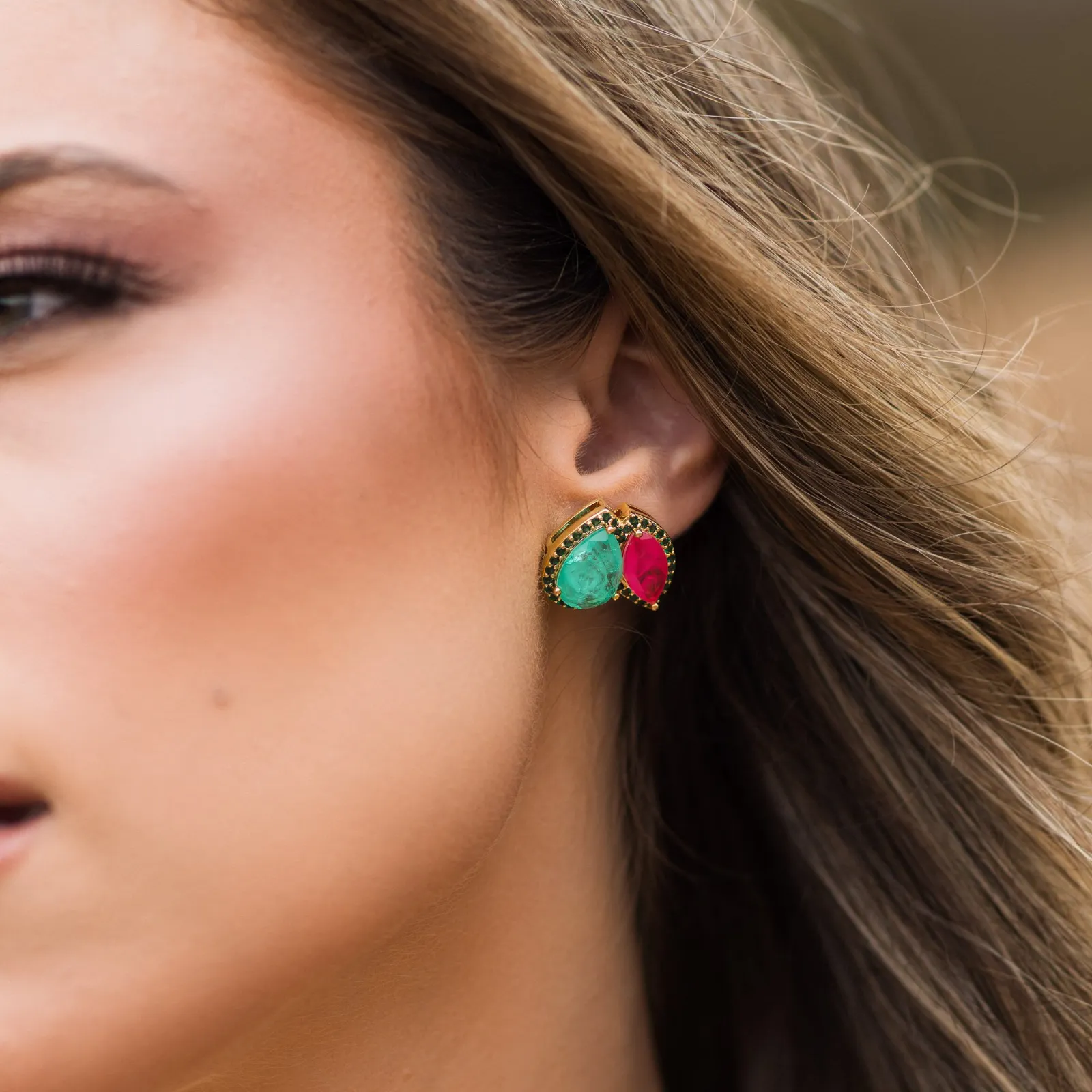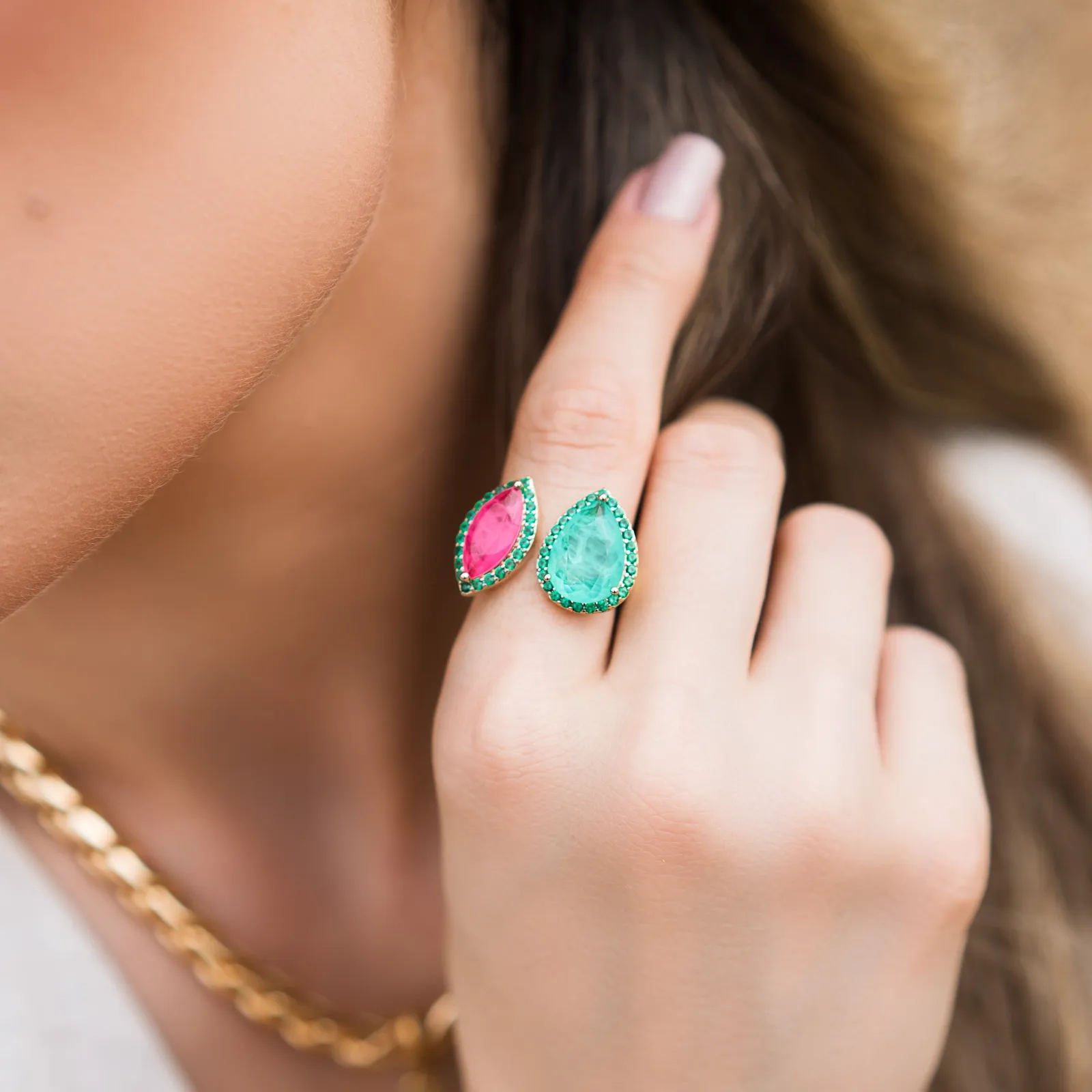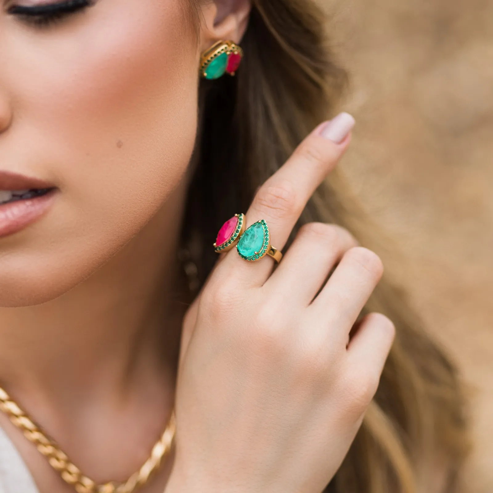 Conjunto Brinco e Anel Caminhos Fusion Turmalina E Fucsia