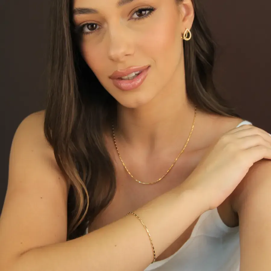 Pulseira delicada com elos retangulares em banho dourado, brilho suave e acabamento polido que realça qualquer look. Leve, confortável e de fácil combinar, ideal para uso diário ou para compor produções mais elegantes. Fecho seguro e design moderno tornam-na perfeita para quem quer um acessório sutil, de qualidade e estilo atemporal.